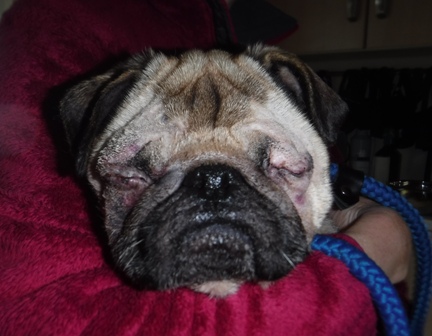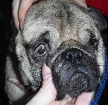 When we heard that a pug was being brought to Durham Dogs & Cats Home under distressing circumstances, we really did not know what to expect. When poor little Alvin arrived at the kennels, he had already been taken to a local vet and had some eye ointment for a severe infection, and underlying problems were detected. When our vet checked him over, she was appalled! Poor little Alvin. Instead of the usual bright, happy little eyes that pugs have (the top left photo shown below), he had two shrivelled little marbles sitting in his eye sockets. Pugs are quite prone to corneal ulcers, a horribly painful condition, and if left untreated the eyeballs will actually rupture and shrivel down to small hard lumps. This had happened to Alvin not once but twice!