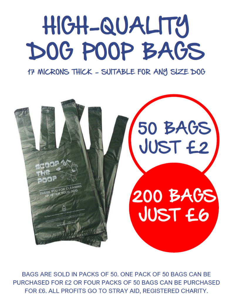 Durham Dogs & Cats Home is committed to encouraging everyone to pick up after their dogs. We provide good quality, 17 micron thick dog poo bags at 4p per bag if you buy 50 at a time (£2 per pack), or 3p each if you buy 100 at a time (£3 for two packs).