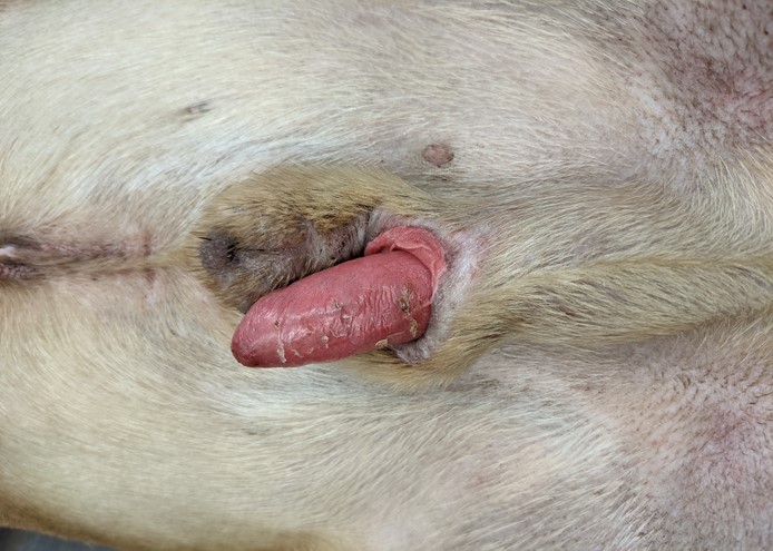 Enzo’s prepuce, or ‘sheath’, had 2 openings in it – the usual opening at the end, and a second opening around halfway down. This second opening meant Enzo’s penis protruded through, leaving it exposed, dry, and a little sore.
