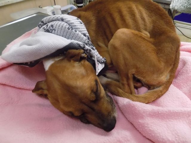 In the depths of winter 2018, just 5 days before Christmas, an extremely malnourished dog was brought to our Coxhoe Rescue Centre. her condition was the worst our team has seen. She could barely hold her head up, and was unable to stand. She was so skinny we couldn’t even be sure what breed she was. Her condition was so critical, we weren’t sure she would survive the night. Being unchipped and without a collar, we decided to call her Holly.