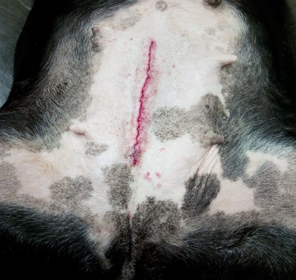Lucy is an 8 year old Bulldog who came to us after being lost. Our staff immediately noticed that Lucy had 2 very large swellings under her tummy and were worried that they may be tumours. Our Vet examined her and found the swellings to be soft, one in each groin area, left and right. Lucy was anaesthetised and the large swellings investigated.