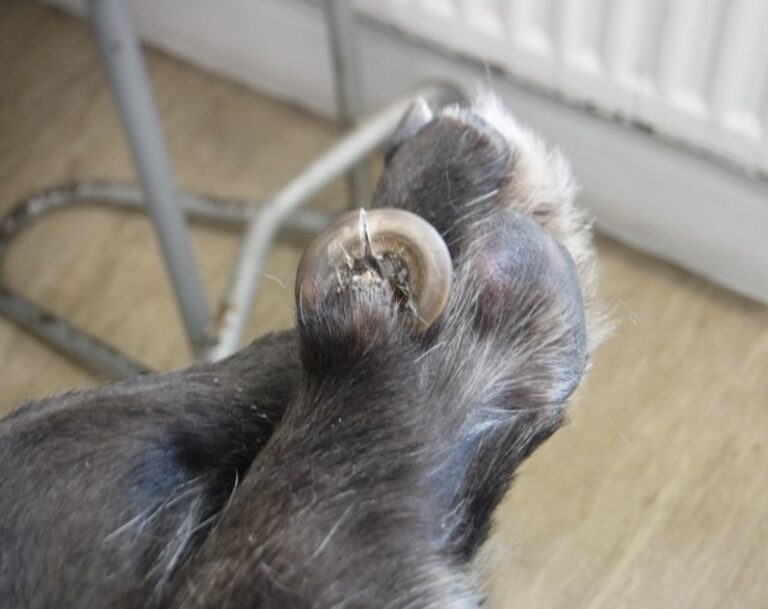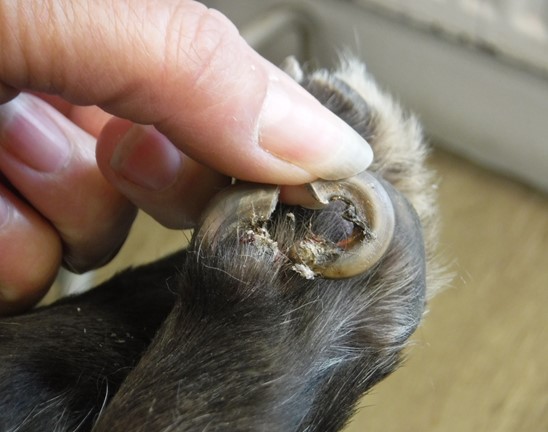 Meg, a 9 year old Collie cross German Shepherd came in to Durham Dogs & Cats Home in need of some TLC and a good grooming. She clearly hadn’t been brushed or checked over in a long time. When we came to clip her claws, they were so overgrown that one of the dew-claws on her front feet had grown round and was embedded into the pad of her toe by at least 1cm. This poor girl must have been in so much pain. The claw was cut where you can see in the photo and then pulled out of her pad, along with blood and pus.