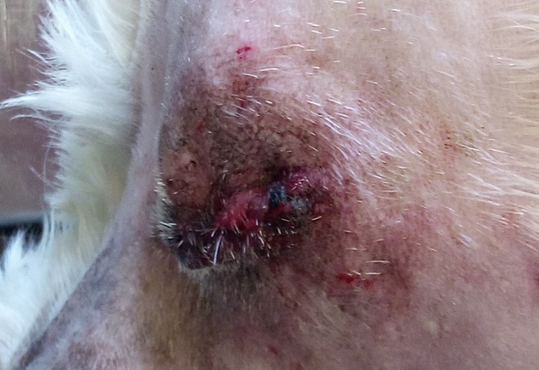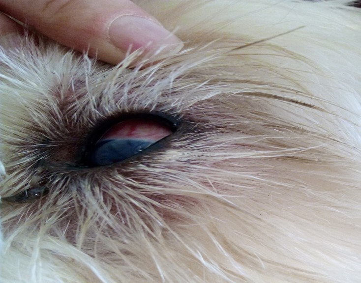 Miles, a nine and a half year old Westie was found straying in February 2021. Not only did Miles arrive with an infection in both his ears, he had a very painful eye. His left eye was larger than normal, the sclera (white of the eye) was very red and there was blood inside the eyeball.