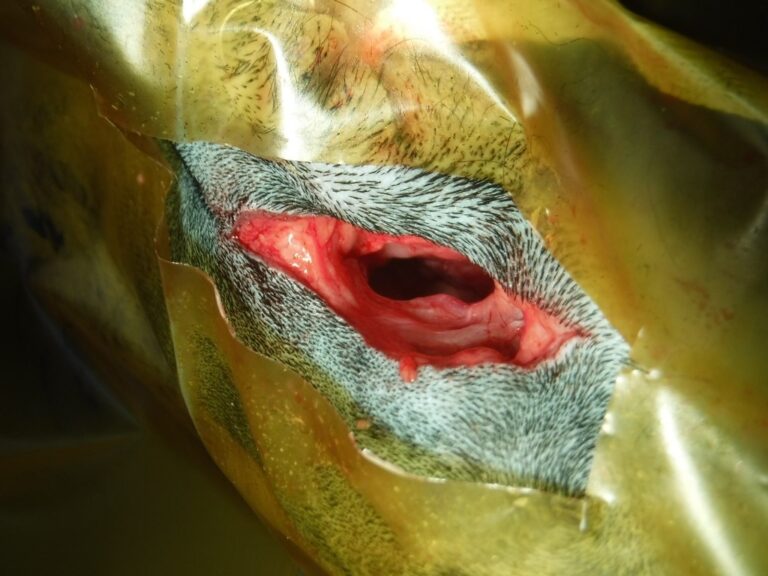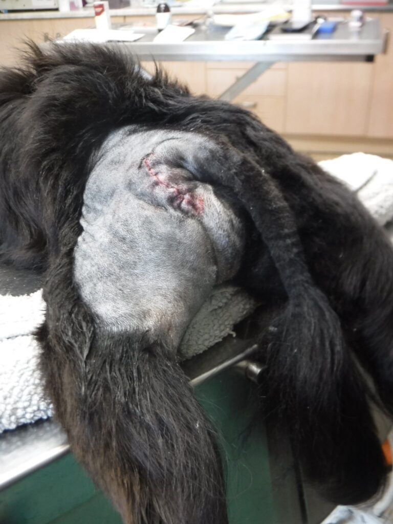 To start the operation, Ozzy was anaesthetised and the area clipped for surgery. This gave on on-site vet team a clear view of his hernia. The vet then cut over the hernia and pushed the fat back into his abdomen, where it belonged. You can see the whole in Ozzy’s muscle left by the hernia below.
