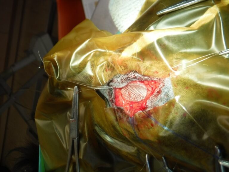 Before the sterile surgical mesh was inserted, the hole in his muscle has prepared with total of 9 stitches. This was a very intricate and delicate part of Ozzy’s operation as the location of his hernia was so close to vital blood vessels and nerves. Thankfully, our skilled team was able to avoid any complications and the mesh, which was shaped into a cone to match the hole, was inserted and tied to the 9 stitches.