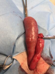 However, it should be remembered that, apart from unwanted pregnancies, there are other issues that can arise, as our vet found out this week when she carried out a routine spay on a 3-year old house cat whose owner could no longer care for her. Cats will come into season every 2-3 weeks from around 4 months of age, and their breeding season is usually between February and October each year. Even cats who never go outdoors and who don’t come into contact with male cats still come into season. Having repeated seasons like this, even without resulting in pregnancy, is very stressful for the cat, and the effect of the hormones on the uterus can be quite dramatic, as you can see from this photograph. Both horns of he uterus are enlarged, and one horn contains a lot more fluid than the other. If this condition is left un-treated (by removal of both ovaries and the entire uterus) then the risk of complications, including pyometra (a potentially life-threatening condition where the uterus can fill up with pus, and can potentially rupture) is high.
