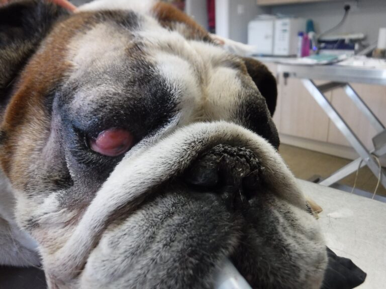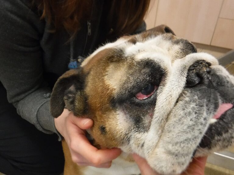 In early 2020, Vito, a British Bulldog, was found straying and was brought to us here at Durham Dogs & Cats Home. It was clear that his eyes were causing him considerable pain. Both of his eyes were infected. His eyelids on the left side were turning inwards, causing his eyelashes and fur to rub against his eye. This caused his eye to go cloudy, making it hard from him to see out of it. Vito also had a condition called “Cherry Eye” in his right eye, meaning an eyelid had prolapsed , making it swollen and sore. Just imagine how uncomfortable this would have been.
